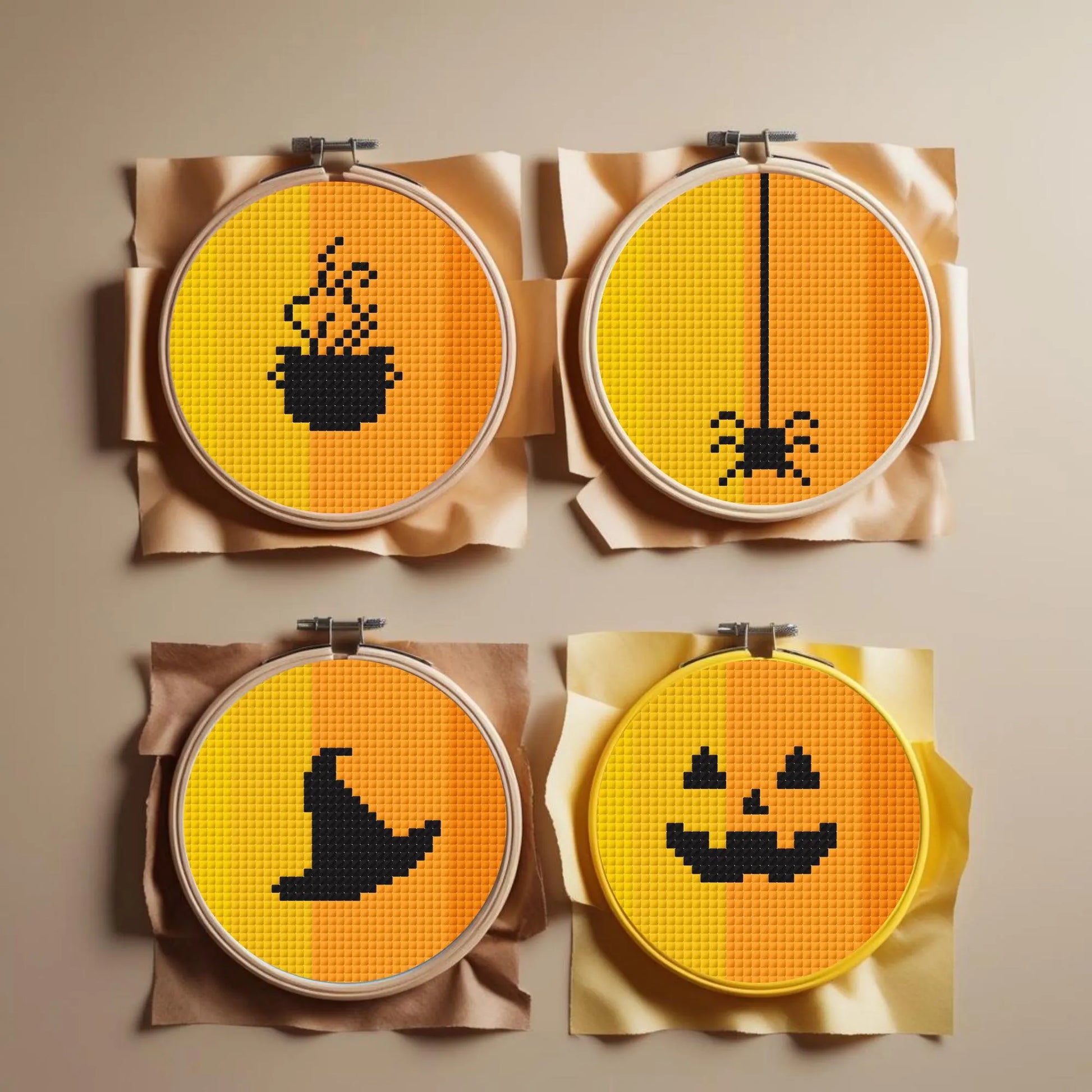Bring spooky charm to your stitching with this Halloween Mini Cross Stitch Pattern Bundle! This set includes 4 small patterns (each 3x3 inches) featuring black silhouettes of a witch’s hat, bubbling cauldron, creepy spider, and grinning jack-o'-lantern — all set against a warm yellow-to-orange ombré background that’s perfect for the season.