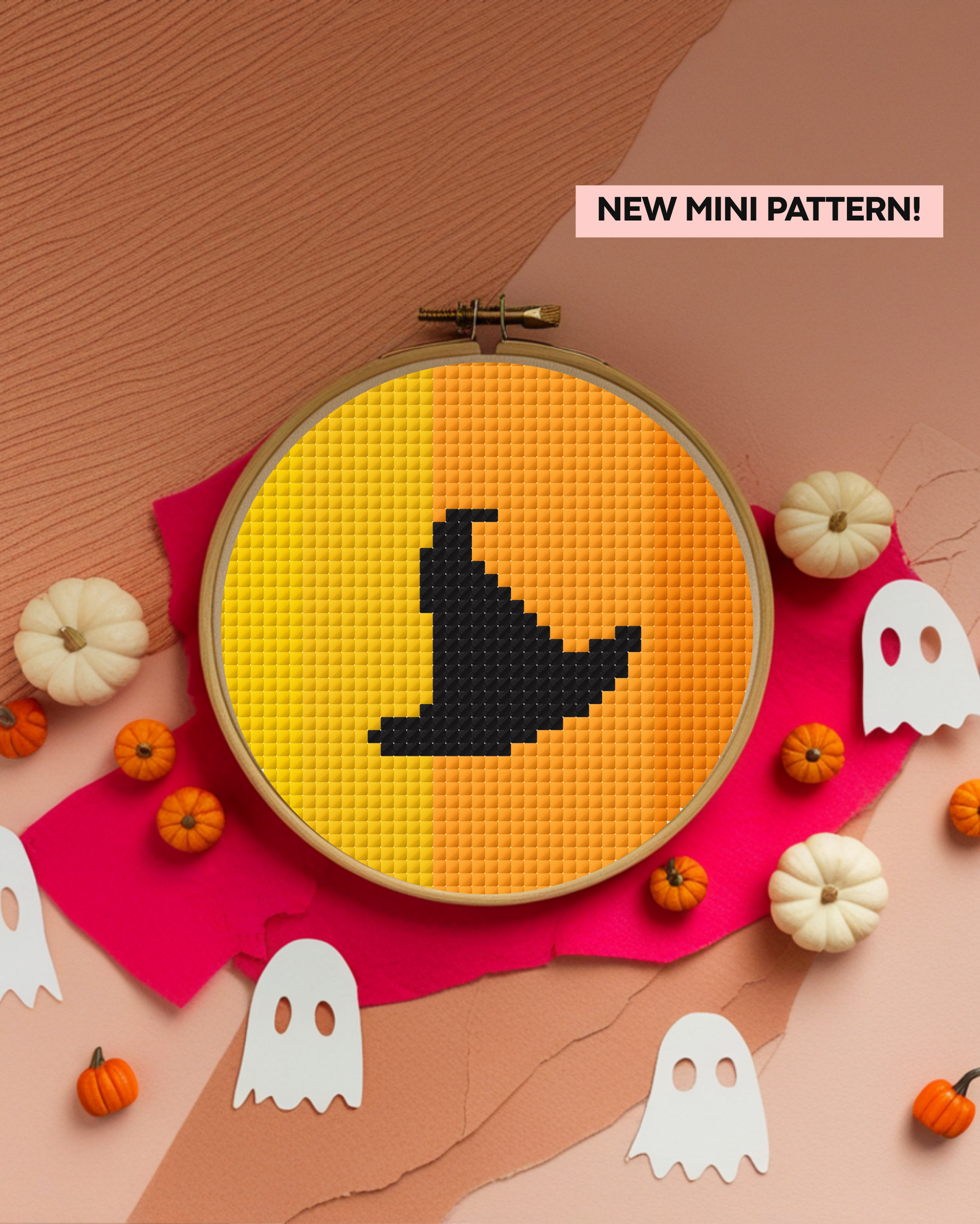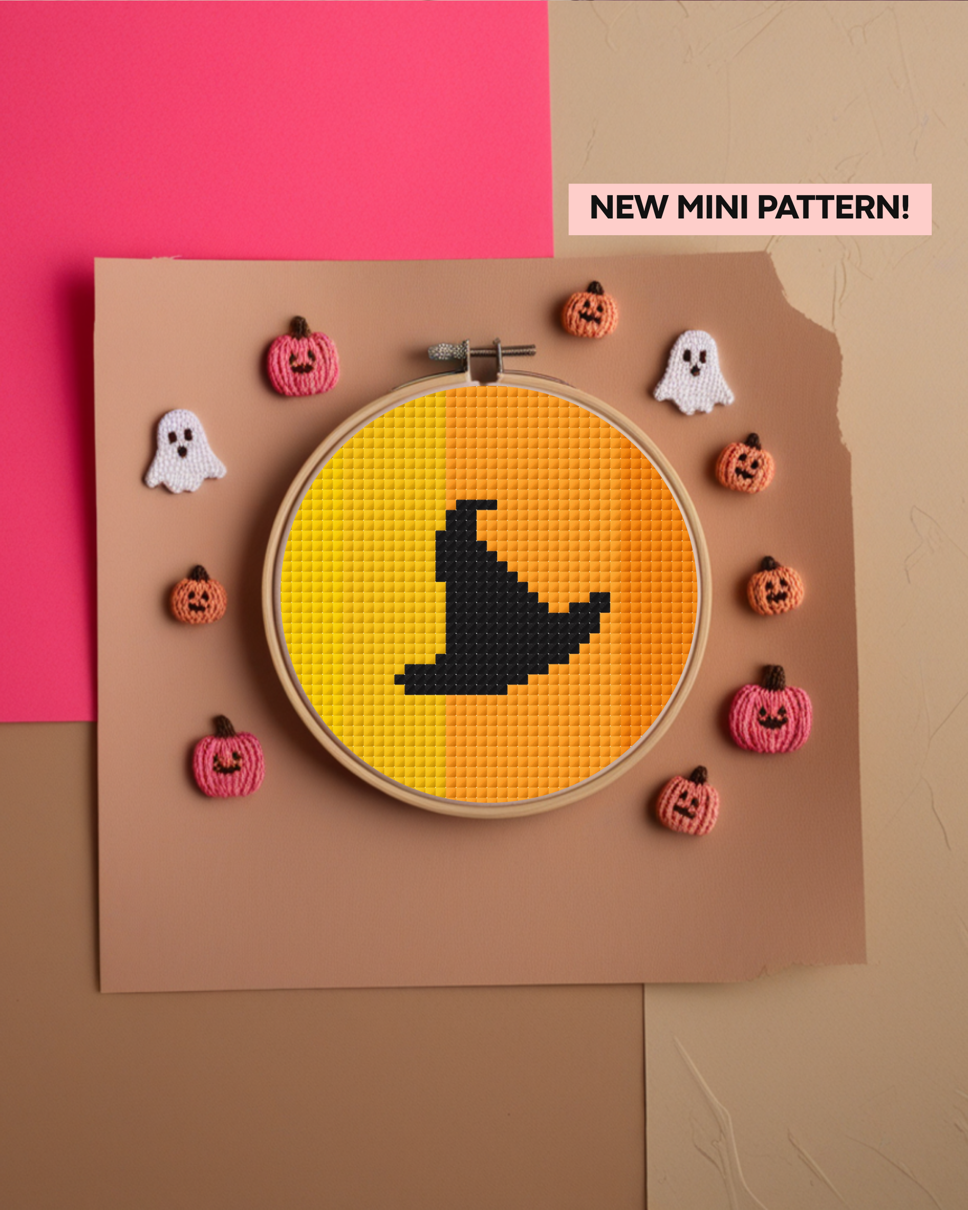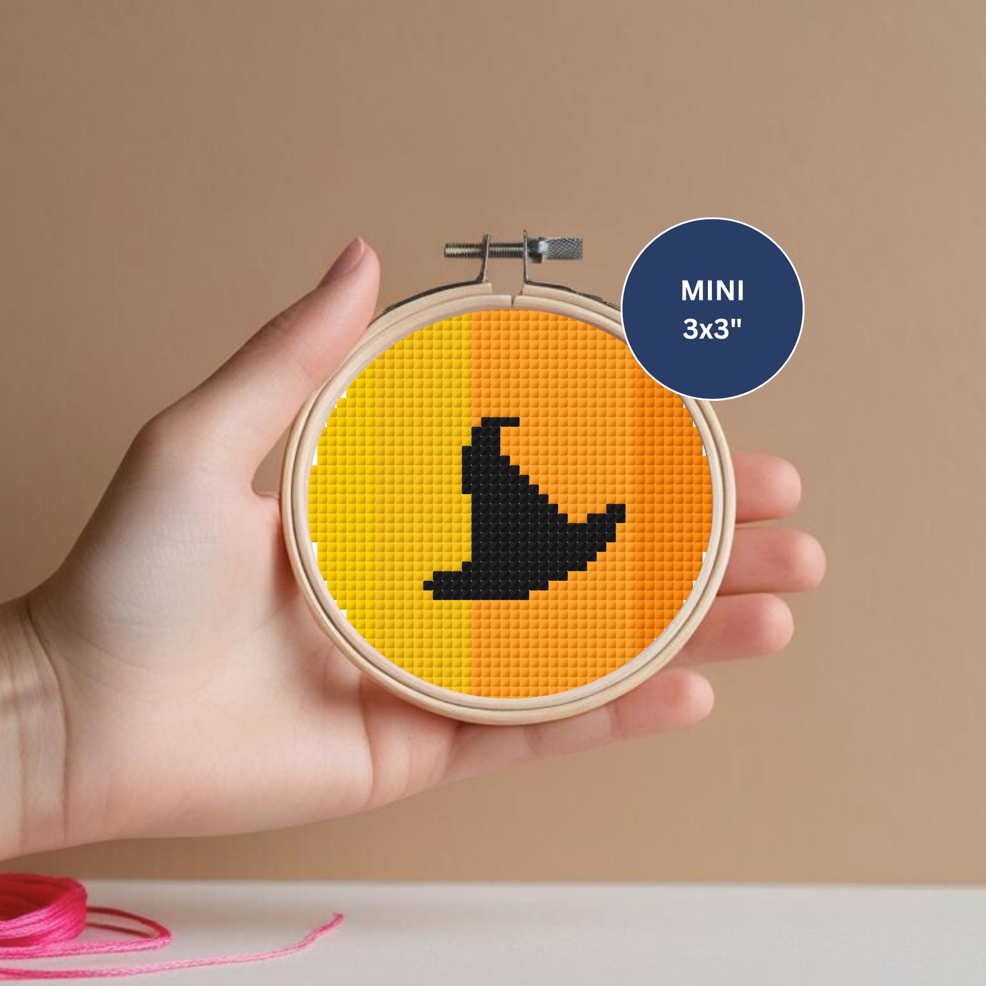 Get into the Halloween spirit with this mini witches hat cross stitch pattern! Designed for spooky season lovers, this easy 3x3 inch PDF pattern is perfect for beginners and seasoned stitchers alike. The black silhouette of a classic witch hat pops against a stunning yellow-to-orange ombré background, making it a charming and fun project for fall décor, handmade ornaments, or quick gifts.