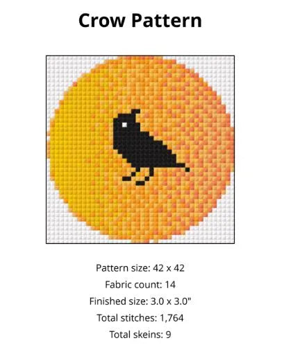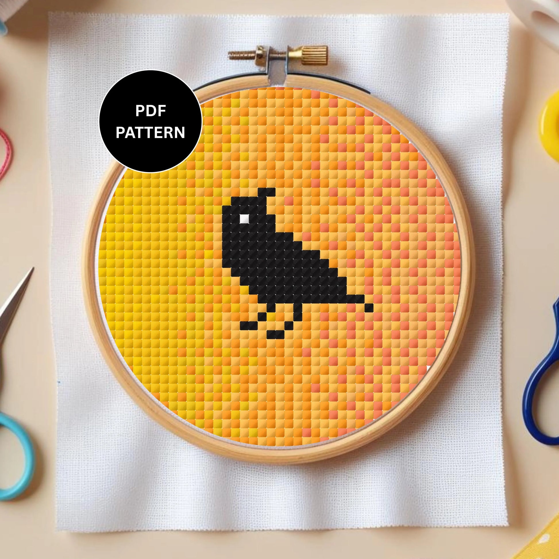 Bring autumn vibes to your craft space with this Mini Crow Cross Stitch Pattern, featuring a gradient ombre background—perfect for fall décor and spooky-season stitching. This counted cross stitch chart PDF includes: